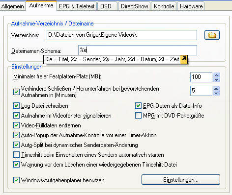 Die Dateinamen der Aufnahmen erzeugt der DVBViewer automatisch. Sie setzen sich aus dem Titel (sofern im EPG verfügbar), dem Sendernamen, dem Datum, und der Uhrzeit zusammen. Die Zusammensetzung können Sie in den Aufnahme-Optionen ändern. Der DVBViewer GE verhindert das Überschreiben gleichnamiger Dateien, indem er notfalls eine Nummer an den Namen anhängt.