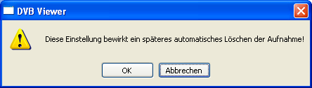 Der DVBViewer GE beendet und löscht eine Timeshift-Aufnahme automatisch, wenn Sie den Sender verlassen, also auf einen anderen Sender umschalten, eine Datei oder DVD abspielen oder den DVBViewer beenden. Die Option „Einstellungen/ Optionen/ Aufnahme/ Warnung vor dem Löschen einer wiedergegebenen Timeshift-Datei“ sorgt bei Bedarf dafür, dass Sie eine Warnung erhalten, bevor ein Senderwechsel eine zeitversetzte Wiedergabe unwiderruflich abbricht. Bei Wiedergabe der Live-Position unterbleibt die Warnung.