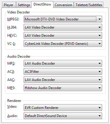 The DirectShow Tab allows to select the video/audio decoder and video renderer that are used for playback. The settings take effect immediately. If you select a decoder, the filter graph (the chain of DirectShow playback components ) will be rebuilt at once.