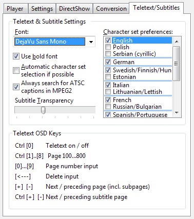 The TSPlayer is able to display teletext and subtitles „on screen“ in the Video Window, if according data is included in a transport stream (TS) file. It supports the following kinds of subtitles: Teletext, DVB, ISDB, ATSC CEA 608 closed captions and BluRay (BD presentation graphics in TS and M2TS files). This chapter describes how to adjust the teletext and subtitle display to your needs.