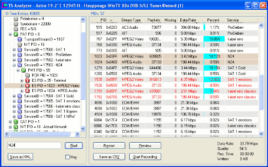 Der TS Analyzer ermöglicht einen tiefen Einblick in das, was auf einem Transponder gesendet wird. Auf der rechten Seite listet der Analyzer alle vorhandenen Streams auf, die dazugehörigen PIDs, Stream-Typen, plus statistische Angaben wie eine Paketzählung und die Datenrate. Die Baumansicht auf der linken Seite spiegelt den Inhalt der gesendeten SI-Tabellen (Service Information) wieder. Der Analyzer wertet sie Bit für Bit aus, übersetzt sie in eine lesbare Struktur und bietet damit alle erhältlichen Informationen über DVB-Netzwerke, Transponder, Services, Bouquets, Sendungen usw.
