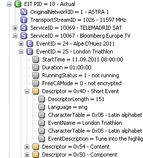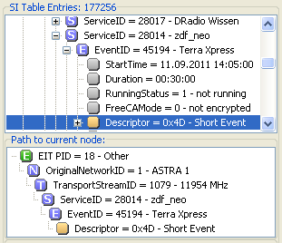 Die nächste: SDT. Service Descriptor Table. Wieder eine Liste von Services, wie diejenige in der PAT, aber mit zusätzlichen Informationen. Z.B. ob ein Service zur Zeit gerade läuft (Running Status). Ob er nur EPG-Informationen für die momentane und die nachfolgende Sendung bietet (EIT Present-Following Flag) oder einen ausführlicheren EPG für mehrere Tage (EIT Schedule Flag). Ob einer oder mehrere Streams des Service verschlüsselt sind (Free CA Mode). Und am wichtigsten: Service Deskriptoren, die den Namen des Service und des Anbieters enthalten. Nun wissen Sie, warum der TransEdit-Scanner PAT, PMT und SDT lesen muss. Ohne SDT würden gefundene Sender nur als „Service xxxx“ erscheinen.