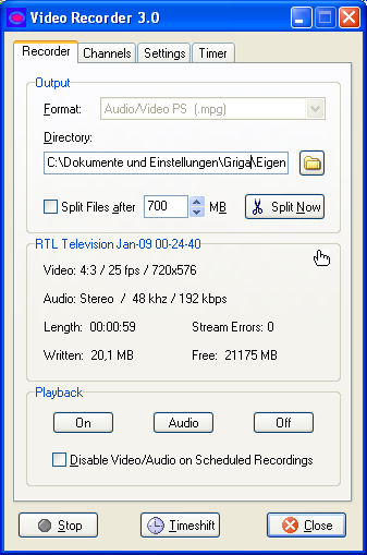 Die Timeshift-Schaltfläche startet den TSPlayer und lässt ihn die laufende Aufnahme wiedergeben. Die Video/Audio-Wiedergabe des DVBViewers wird automatisch abgeschaltet, während der TSPlayer läuft (ohne die Aufnahme zu beeinträchtigen).
