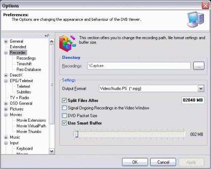 Before starting your first recording, the location for the recordings must be set. The default setting is a sub-folder in the DVBViewer-folder. You can also set the path for time shift recordings. Those adjustments can be made at settings/options/recorder.
