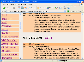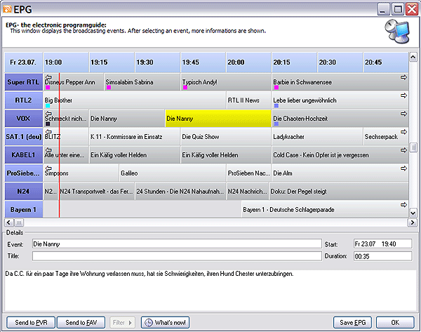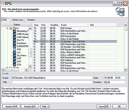 Basically there are three EPG modes: A station-specific list (as shown above), as well as a time-specific list (full version only), which shows the broadcasts of different stations running at a certain point in time. Switching between these two modes is done by clicking the button "Whats now...". First the possibilities, which both modes are offering: