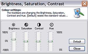 This symbol opens a window with four sliding controls for brightness, saturation, contrast and the hue of the television picture. These settings are also available via the context menu.