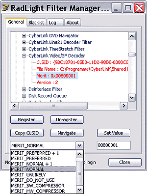 If you do not want to remove a filter completely, but achieve that the filter manager does not prefer it, you have to lower its Merit value. This value is located in the registry, but usually encoded and hard to find. Therefore Radlight® provided a small tool, the Radlight® Filter Manager. You can download it in the members' area at www.dvbviewer.com/members.