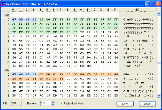 The Hex View Window captures a number of data packets from the stream (188 bytes each), displays the bytes as hex numbers, and additionally on the right as ASCII characters, so you can see if there is readable text inside. Some data sections are marked with a background color: